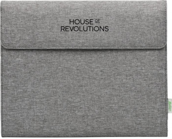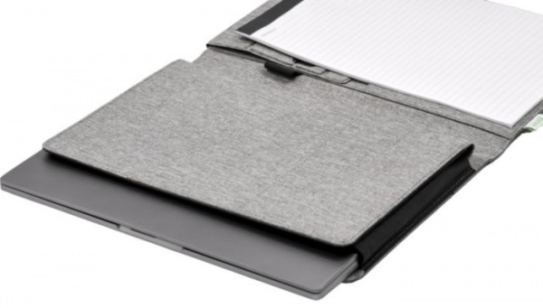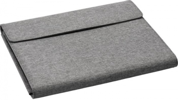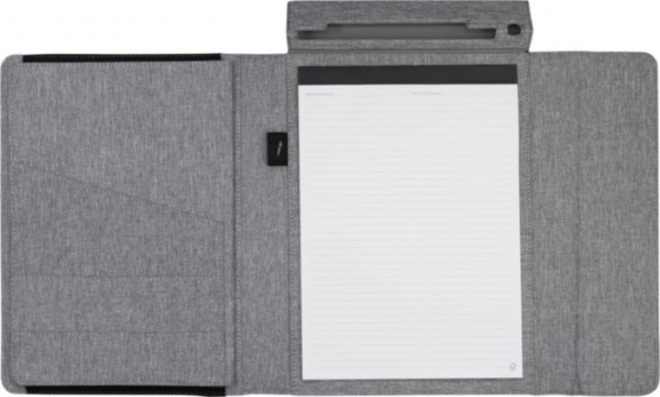 Portfólio Noty Folio z recyklovaných PET fliaš a papiera. Obsahuje priestor na poznámkový blok A4, vrecko na tablet/notebook (do 13") a priehradky na drobnosti, ako sú vizitky. Magnetický uzáver, pevná väzba a rozkladací organizér na stôl.