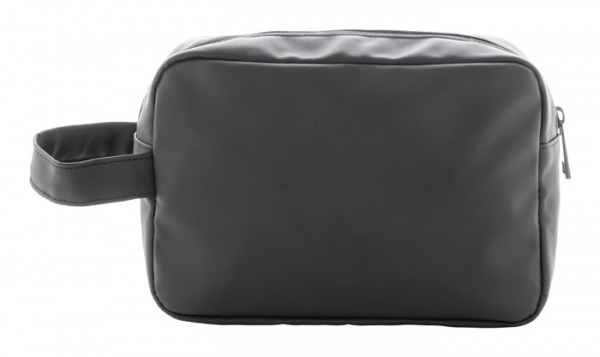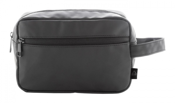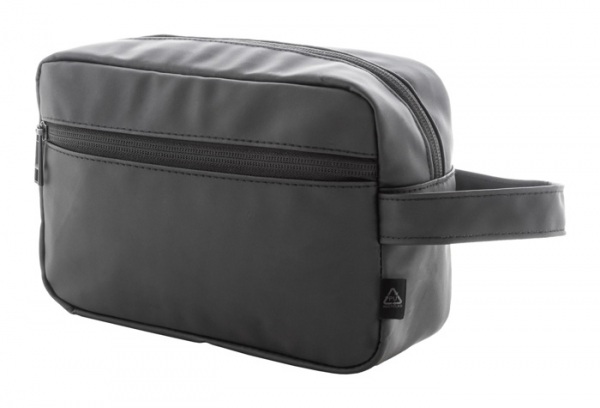 Kozmetická taštička z mäkkej recyklovanej PU kože s dvoma priehradkami na zips a uchom.