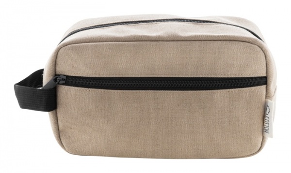Kozmetická taštička z recyklovaného plátna s dvoma priehradkami na zips a rukoväťou. 70% recyklovaná bavlna a 30% RPET polyester. S výrazným štítkom z recyklovanej bavlny.