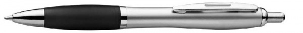 Plastové guľôčkové pero s matným strieborným telom a farebnou gumovou rukoväťou. Pero má modrý atrament.