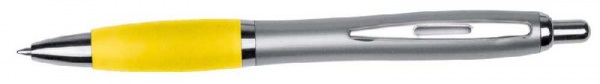 Plastové guľôčkové pero s matným strieborným telom a farebnou gumovou rukoväťou. Pero má modrý atrament.