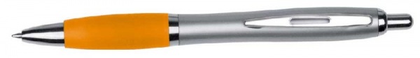 Plastové guľôčkové pero s matným strieborným telom a farebnou gumovou rukoväťou. Pero má modrý atrament.