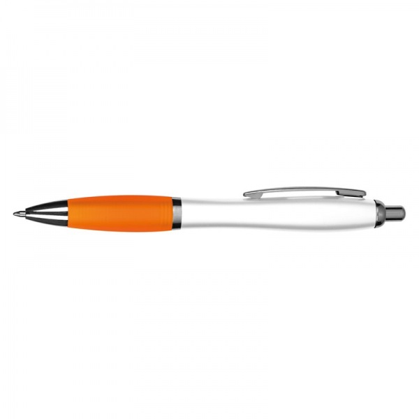 Plastové guľôčkové pero s kovovou sponou a farebnou pogumovanou rukoväťou. Pero má modrý atrament.
