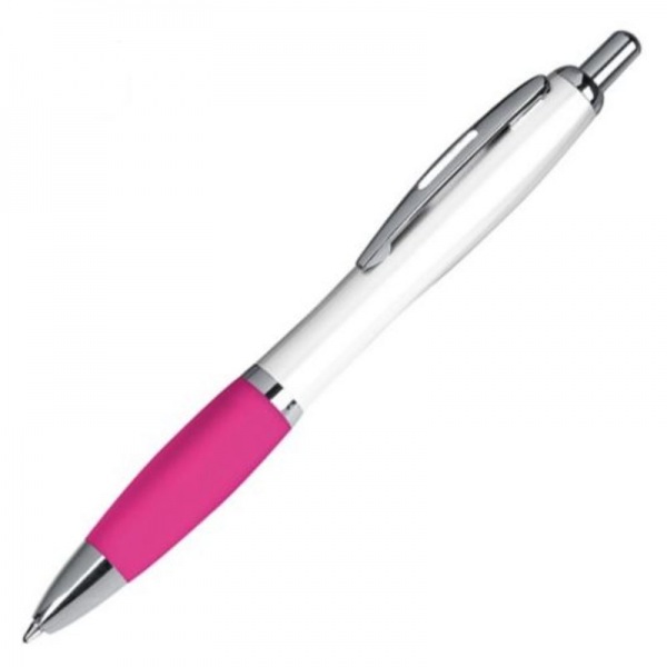 Plastové guľôčkové pero s kovovou sponou a farebnou pogumovanou rukoväťou. Pero má modrý atrament.