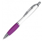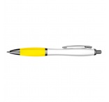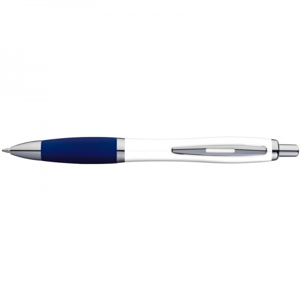Plastové guľôčkové pero s kovovou sponou a farebnou pogumovanou rukoväťou. Pero má modrý atrament.