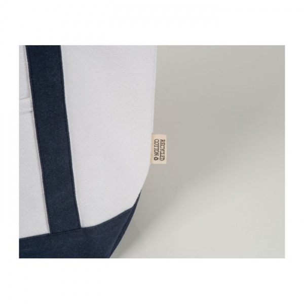 Malá taška (730 g/m2) z recyklovanej bavlny s dvoma farebnými dlhými popruhmi a stabilným dnom. Univerzálne použitie na nákupy, pláž a pod.