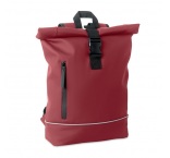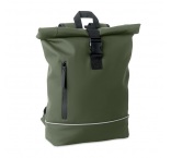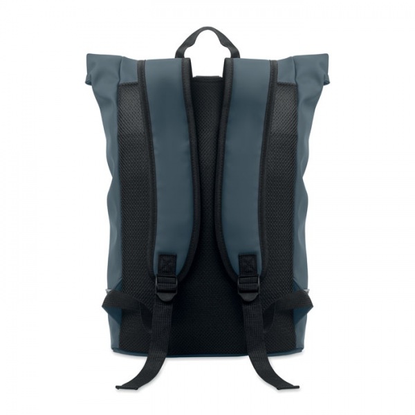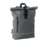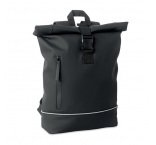 15-palcový batoh na notebook s rolovacím vrchom z mäkkého PU s polstrovaným chrbtom a výstužou dna s reflexným pásikom. Vodeodolné predné vrecko na zips. Podšívka z 210D RPET polyesteru.