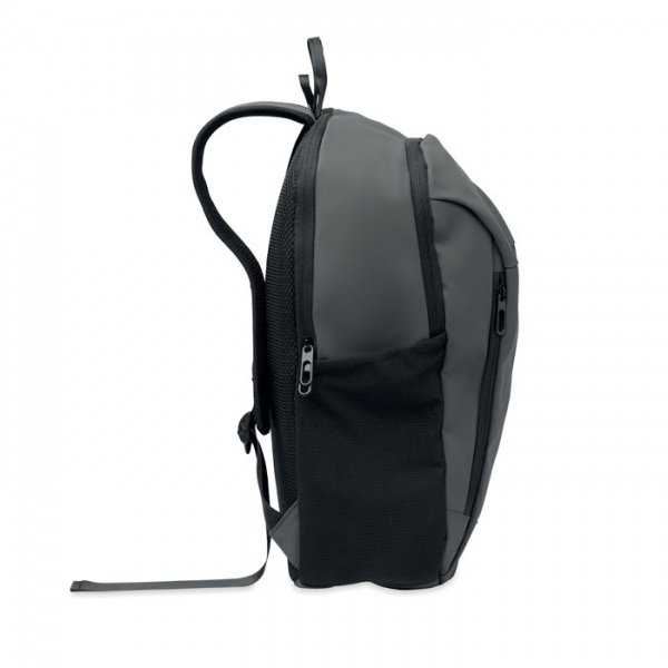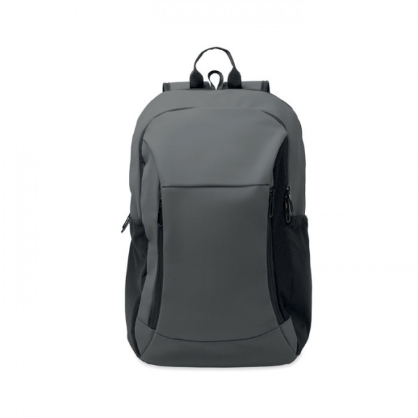 15-palcový batoh na notebook z mäkkej PU tkaniny s polstrovaným chrbtom a skrytým hlavným priestorom na zips. 1 predné vrecko na zips, 2 bočné vrecká na zips vpredu a 2 bočné vrecká z elastickej sieťoviny. S podšívkou z 210D RPET.