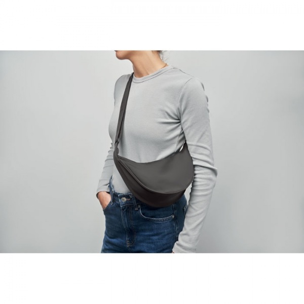 Polmesiacová crossbody kabelka z materiálu Oxford 400D a podšívky z RPET 210D. Jedno hlavné vrecko na zips a 2 vnútorné vrecká.