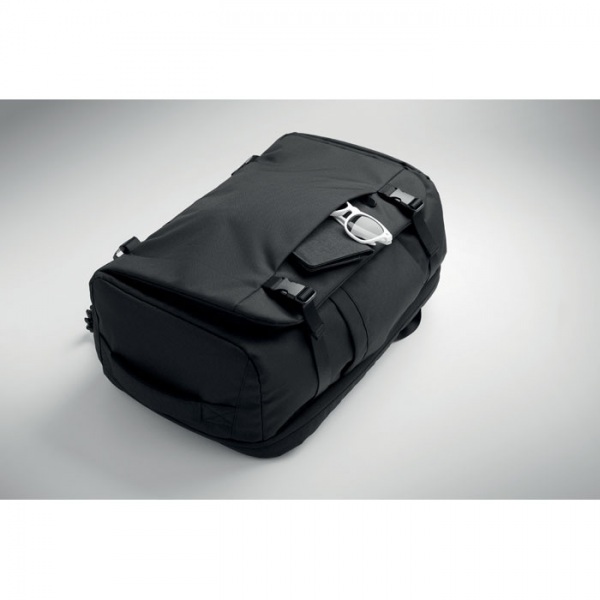 Veľký cestovný batoh na notebook s rozmerom 17 palcov z polyesteru 600D RPET. Má niekoľko priehradiek, jednu hlavnú na oblečenie a dve polstrované na notebook, tablet a ďalšie veci. Polstrovaný chrbtový panel, ramenný popruh a rukoväť.