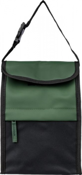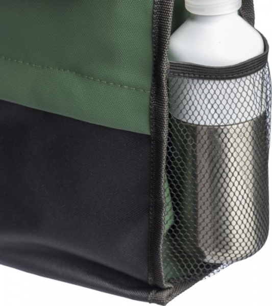 Chladiaca taška s vodeodolným PU záterom. 2 mm PE výplň a hliníková podšívka. Predné vrecko na zips, horná priehradka, bočné sieťované vrecko a lepiaci uzáver. Rukoväť na prenášanie, plastová pracka a ramenný popruh. Objem 5 l, 3 priehradky.