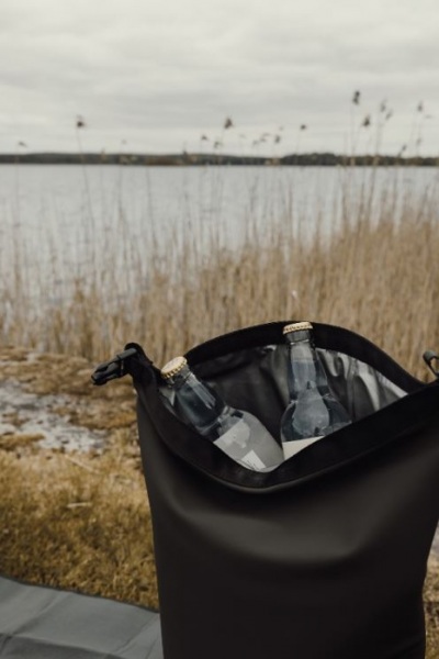 Vrch sa dá zložiť a zrolovať, aby sa bezpečne uzavrel, čo pomáha udržať chlad vo vnútri. Hlboké vonkajšie vrecko pre rýchly prístup a ramenný popruh pre pohodlné nosenie. Chladiaca taška je podšitá PEVA izoláciou. Obsahuje 23 % RPET s certifikátom RCS.