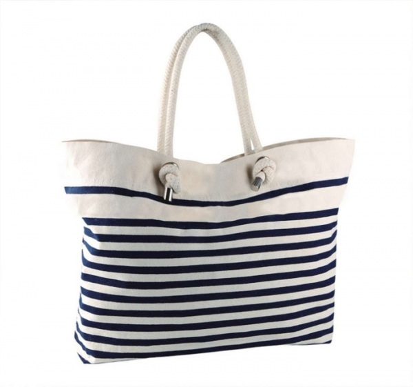 Veľká plážová taška v námorníckom štýle z bavlneného plátna. Uši z bavlneného lana. Vnútorné vrecko na zips. Zapínanie na cvoky