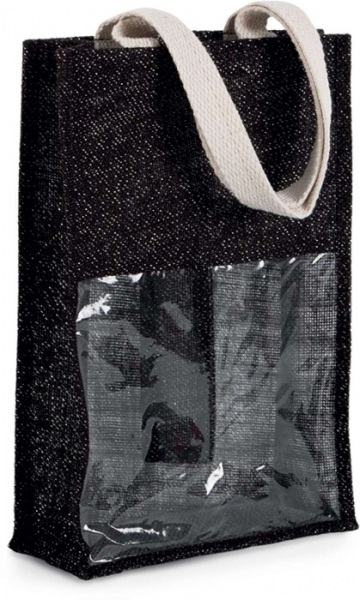 Vrecko na 2 fľaše z jutového plátna s 2 ušami a priehľadným okienkom na prednej strane