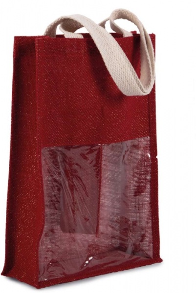 Vrecko na 2 fľaše z jutového plátna s 2 ušami a priehľadným okienkom na prednej strane