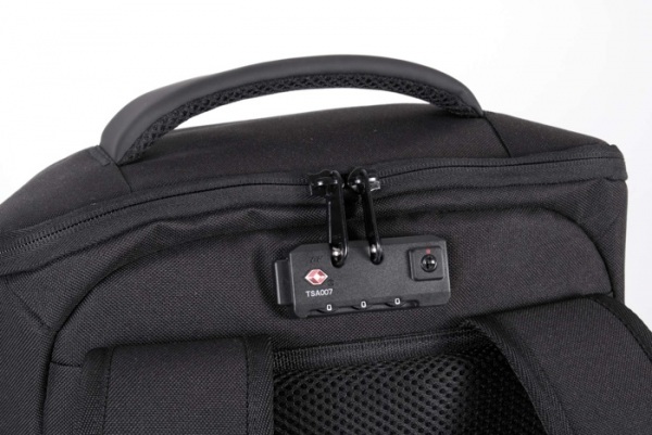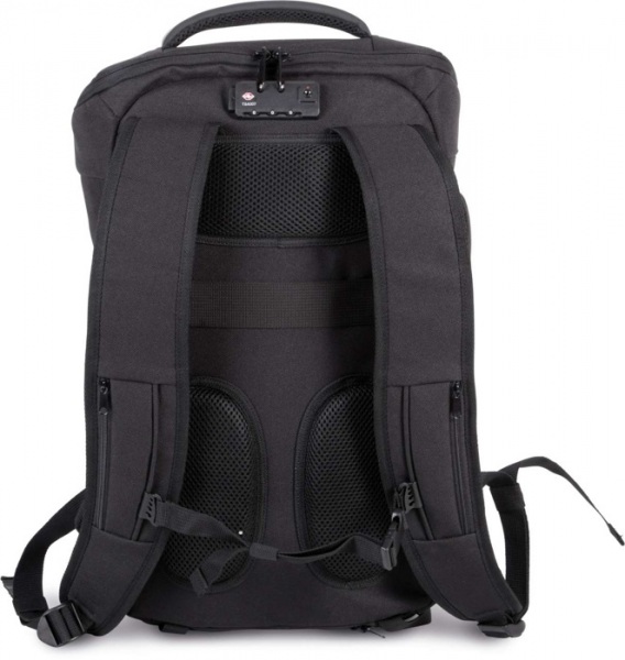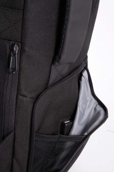 Zosilnený predný panel, TSA zámok. Nastaviteľné popruhy a hrudný popruh. Vrecká na zips na ramenných popruhoch. Vrecko s portom USB. Bočné vrecko s navinutým káblom proti krádeži. Priehradka na notebook do 15“ a tablet 11“ . Integrovaný kryt proti dažďu