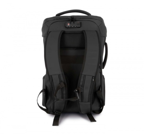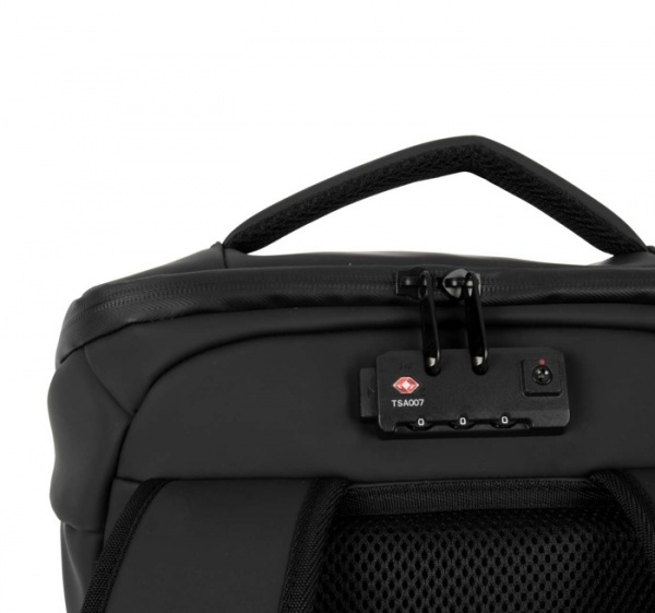 Odnímateľný elastický držiak na prilbu. TSA zámok, bočné vrecko s káblom na zabezpečenie. Vrecko na boku s USB a micro USB portom. Priehradka na notebook 15" a tablet 11". Odnímateľné vrecká na príslušenstvo. Výstuhy na chrbte, nastaviteľné popruhy.