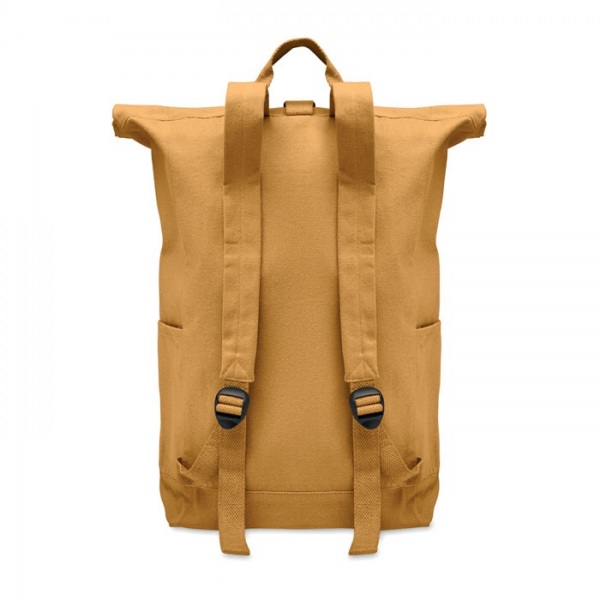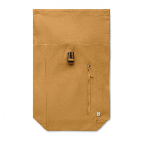 Batoh s rolovacím vrchom a zapínaním na suchý zips z 390 g/m2 recyklovanej bavlny (80 %) a recyklovaného polyesteru (20 %). Predné vrecko na zips.