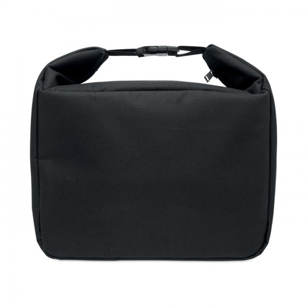 Chladiaca obedárová taška s vnútorným indikátorom teploty vyrobená z 600D RPET s 3 mm PE penou s hliníkovou fóliovou podšívkou. Zapínanie na pracku. Hlavný priestor na zips. S bočným vreckom na zips. Objem: 10 l.