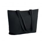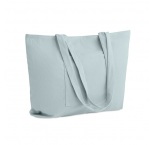 Veľká nákupná/plážová taška z polyesterového menčestru so zapínaním na zips zhora, otvoreným predným vreckom a vnútorným vreckom.