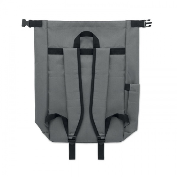15-palcový batoh na notebook s rolovacím vrchom vyrobený z polyesteru 600D RPET s polstrovanou podšívkou z 210D RPET. Má predné vrecko na zips, elastické bočné vrecko a nastaviteľné ramenné popruhy.