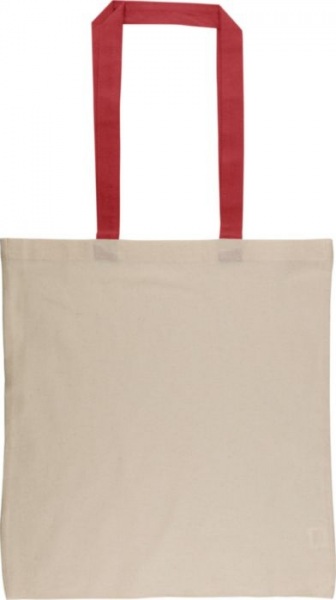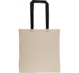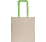 Nákupná taška z bavlny Oeko-Tex® (140 g/m2) v prírodnej farbe s farebnými rúčkami. Rozmery 38 × 42 cm s rúčkami dlhými 70 cm (šírka 2,5 cm). Vrátane štítku Oeko-Tex®.