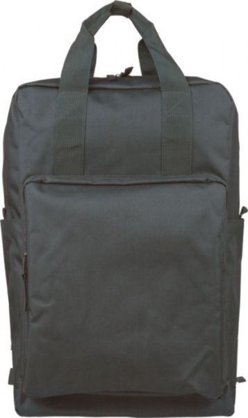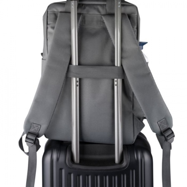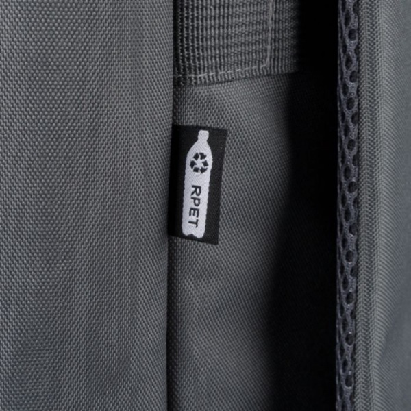Batoh z recyklovaného polyesteru 900D s podšívkou 210D a štítkom rPET. Obsahuje veľkú hlavnú priehradku s vreckom na 16-palcový notebook, prednú priehradku, dve bočné vrecká, popruh na kolieskach, horné rukoväte s gombíkom a vetrané ramenné popruhy.