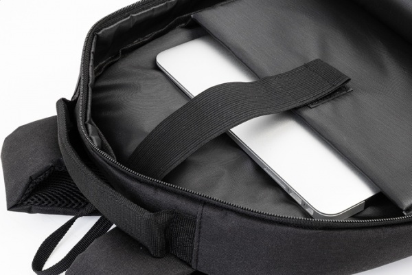 Batoh z RPET s priehradkami na zips, 2 prednými vreckami na zips, bočnými vreckami na zips a polstrovanou priehradkou na notebook (15"). S polstrovaným chrbtom a ramennými popruhmi, vreckom s ochranou proti krádeži a popruhom na kufor. Z polyesteru 300.
