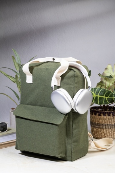 Batoh z recyklovaného plátna s hlavnou priehradkou na zips, polstrovanou priehradkou na notebook (13") a predným vreckom na suchý zips. 70% recyklovanej bavlny a 30% RPET polyesteru. S výraznou etiketou o recyklovanej bavlne.