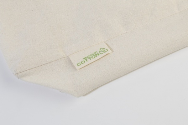 Nákupná taška s klinom a dlhými ušami zo 70% recyklovanej bavlny a 30% RPET polyesteru, 140 g/m2. S výraznou etiketou o recyklovanej bavlne.