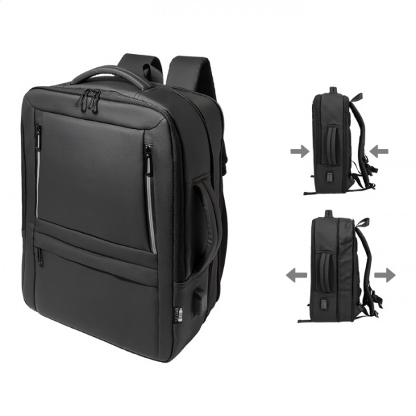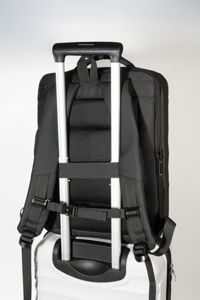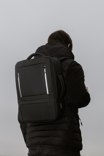 Vodeodolný batoh/taška na dokumenty s možnosťou predĺženia, priehradkou na zips, prednými vreckami s reflexnými zipsami, polstrovanou priehradkou na notebook (15") a tablet (12") a vstavaným USB portom. Popruh na kufor, polstrované popruhy