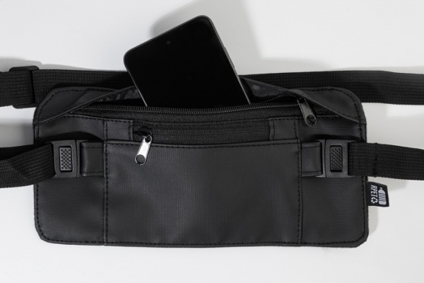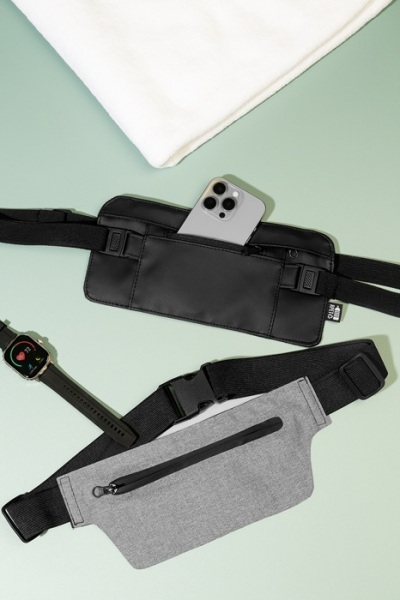 Úzka ľadvinka z RPET s prednou stranou potiahnutou PU, priehradkou na zips a predným vreckom a nastaviteľným popruhom. Polyester 600D RPET s PU záterom a výrazným štítkom RPET.