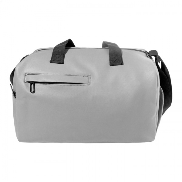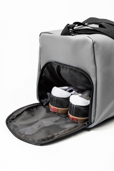 Vodeodolná športová taška z RPET s hlavnou priehradkou na zips, predným vreckom na zips, priehradkou na topánky na zips a nastaviteľným ramenným popruhom. Polyester 600D RPET s PU záterom a výrazným štítkom RPET.