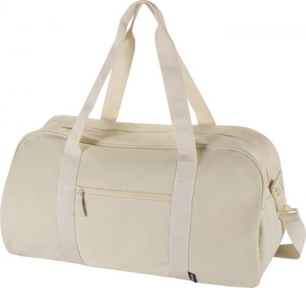 Športová taška z recyklovaného vodeodolného materiálu s certifikáciou GRS. Hlavná priehradka, predné vrecko na zips, mäkké rukoväte a odnímateľné nastaviteľné ramenné popruhy. Objem: 40 litrov.