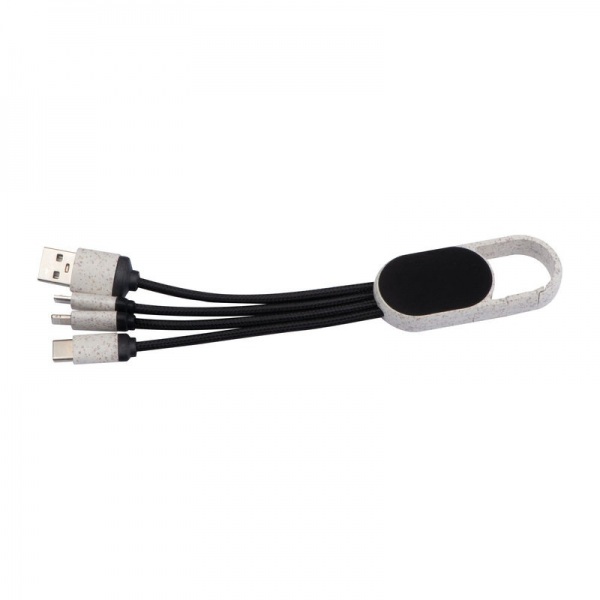 Nabíjací kábel 3v1 z materiálu s obsahom pšeničnej slamy, USB nabíjacím káblom, Micro USB, C-Type a 8 pinovým konektorom. Logo bude počas nabíjania svietiť.