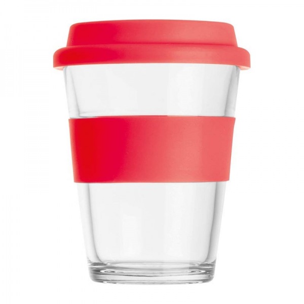 Sklenený pohár s objemom 300 ml, s farebným silikónovým vrchnákom a príslušným prstencom.