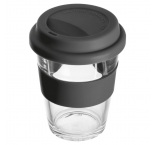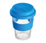 Sklenený pohár s objemom 300 ml, s farebným silikónovým vrchnákom a príslušným prstencom.