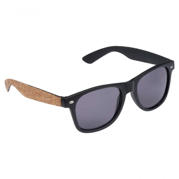 Čierne klasické slnečné okuliare s UV 400 ochranou, kategória filtra 3, rám z kvalitného plastu a stranice s korkom.