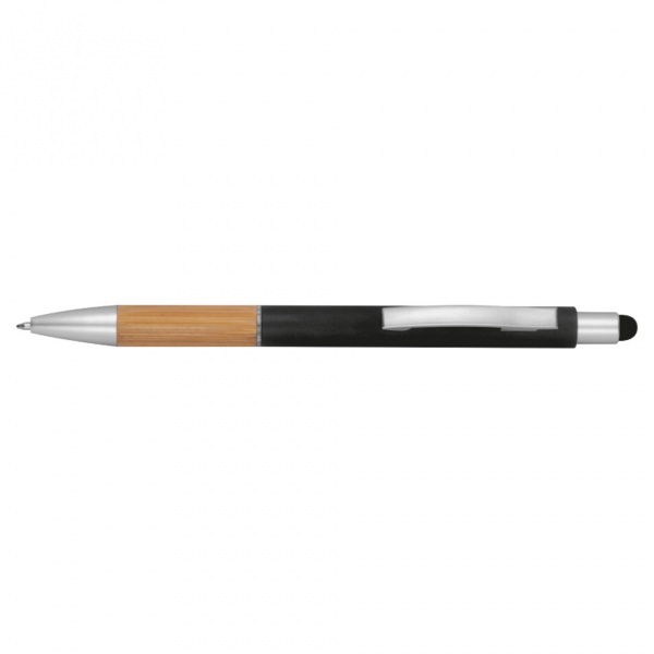 Hliníkové guľôčkové pero s bambusovou úchopovou zónou a dotykovým hrotom. Obsahuje modrú tuhu.