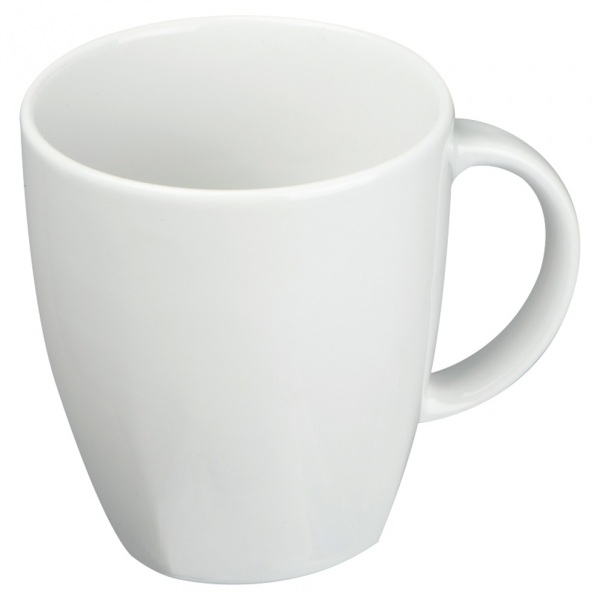 Porcelánový hrnček s objemom 300 ml v nezvyčajnom tvare, ktorý je z vrchu okrúhly, zo spodu hranatý.