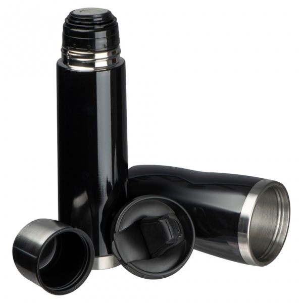 Sada pozostávajúca z termohrnčeka (objem 500 ml) s nepriepustným uzáverom a dvojstenného termohrnčeka z nehrdzavejúcej ocele s objemom 450 ml.