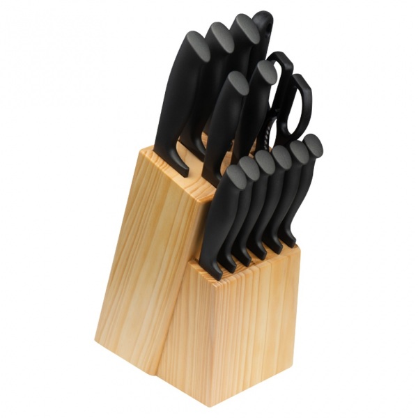 Drevený držiak na nože. Obsahuje 13 nožov s povrchom z titánu.