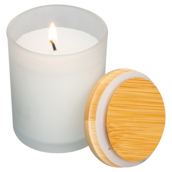 Sviečka v elegantnom matnom skle s bambusovým viečkom, dekoratívna a všestranná.