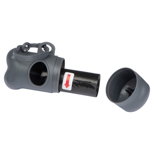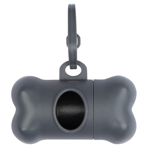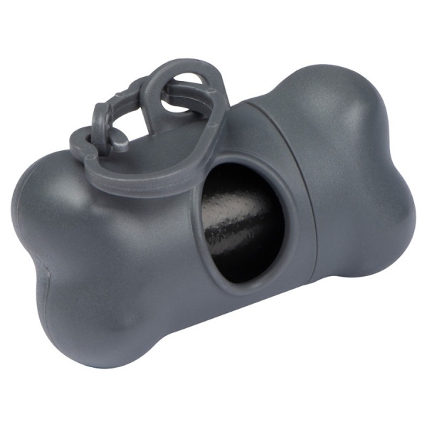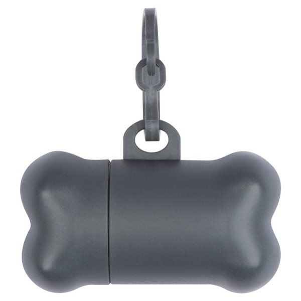 Dávkovač sáčkov na psie exkrementy v tvare kosti s plastovou karabínou a 15 biologicky rozložiteľnými vreckami.