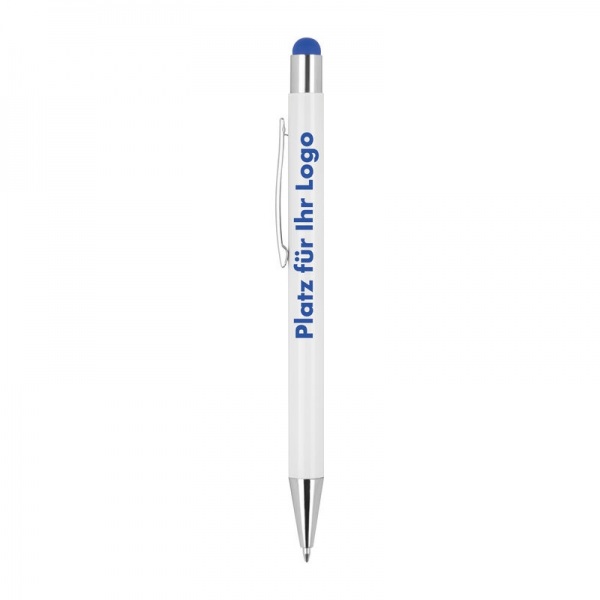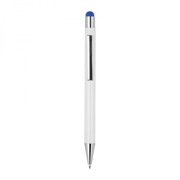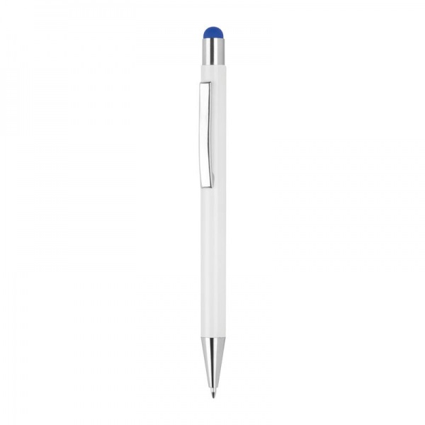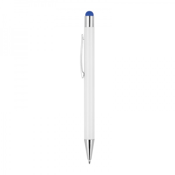 Výsuvné hliníkové guľôčkové pero so striebornými aplikáciami, dotykovou funkciou a modrou náplňou.