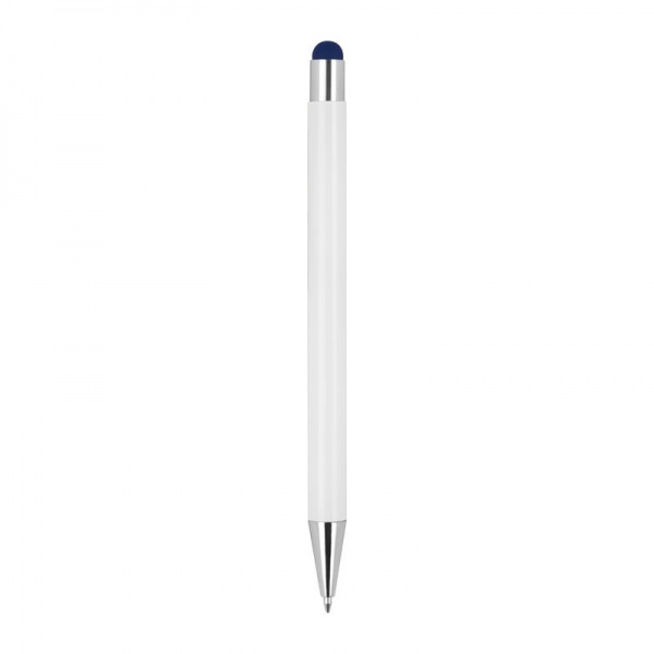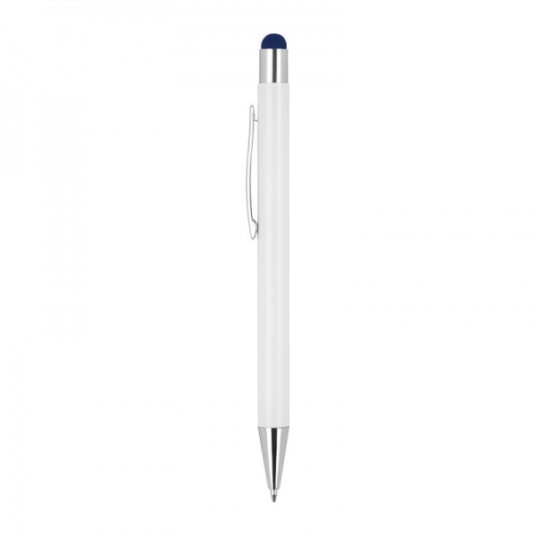 Výsuvné hliníkové guľôčkové pero so striebornými aplikáciami, dotykovou funkciou a modrou náplňou.