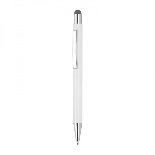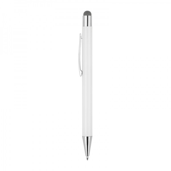 Výsuvné hliníkové guľôčkové pero so striebornými aplikáciami, dotykovou funkciou a modrou náplňou.
