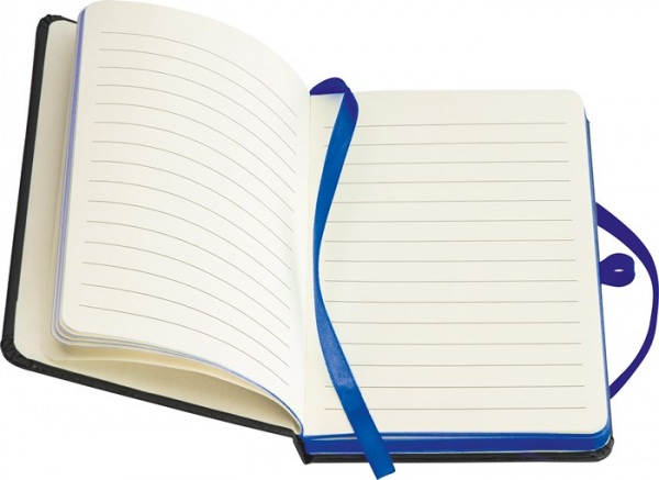 Zápisník s čiernym PU krytom a 160 linajkovanými stranami. Zápisník má farebné doplnky: elastickú gumičku na zatváranie, pútko na pero a záložku.