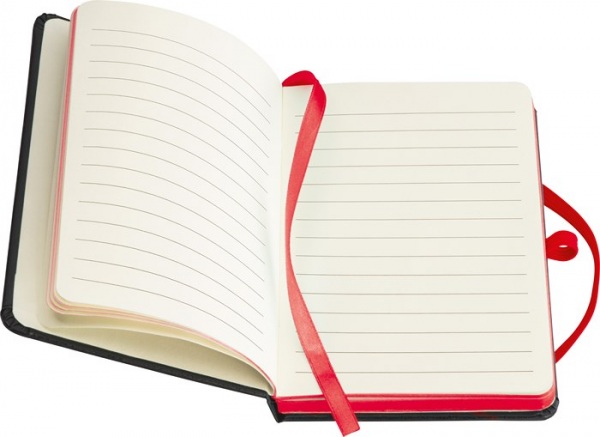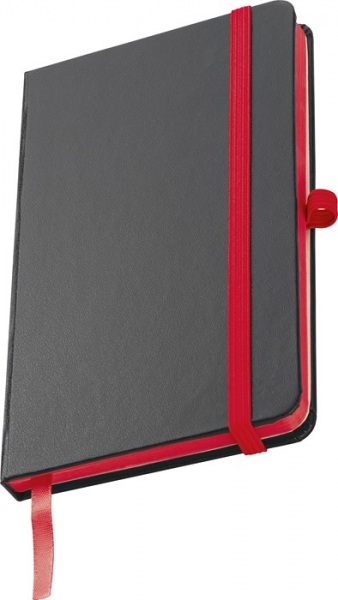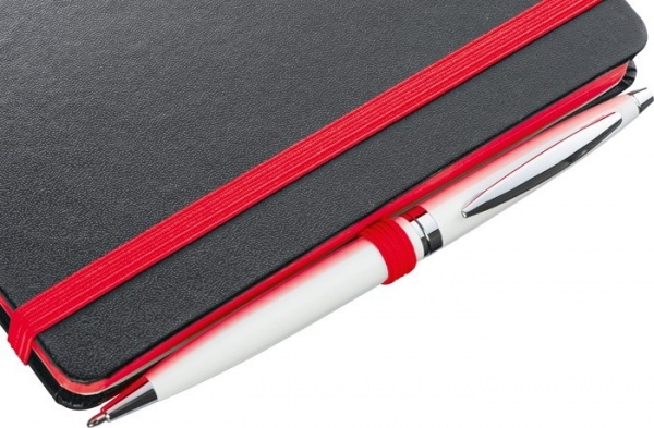 Zápisník s čiernym PU krytom a 160 linajkovanými stranami. Zápisník má farebné doplnky: elastickú gumičku na zatváranie, pútko na pero a záložku.