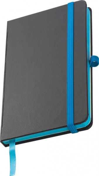 Zápisník s čiernym PU krytom a 160 linajkovanými stranami. Zápisník má farebné doplnky: elastickú gumičku na zatváranie, pútko na pero a záložku.